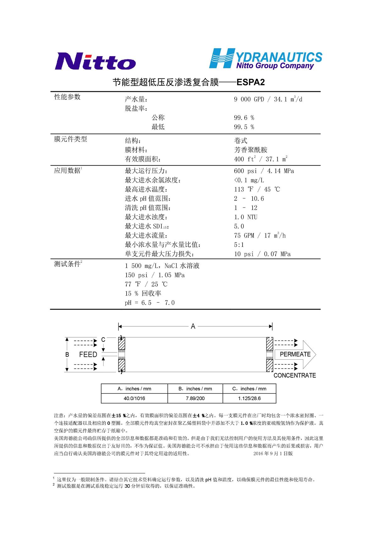 反滲透膜法制取淡水的驅(qū)動力是壓力,反滲透系統(tǒng)中高壓泵的工作壓力直接決定制水成本高低。當(dāng)初的高能耗是制約反滲透法水處理工藝推廣的主要因素之一。所以如何降低反滲透膜的運行壓力來降低運行成本一直是各大膜廠家的主研發(fā)方向之一。ESPA(Energy Saving Poly Amide)系列反滲透膜元件